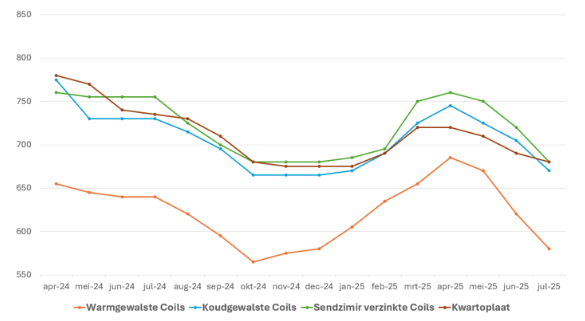 Op dit moment liggen de Europese staalprijzen nog onder het niveau van juni 2025 maar een opwaartse lijn is misschien al zichtbaar. Zoals gebruikelijk is juli een rustigere periode maar volgens NovioStaal kan dit veranderen en zijn er signalen dat sommige fabrieken hun productie voor Q3 inmiddels hebben ingevuld en hogere prijzen aan het uitproberen zijn bij hun klanten. Ondertussen worden er ook contracten afgesloten door handelaren en andere spelers op de markt om later in 2025 of in 2026 te leveren waarbij men uitgaat van een hogere prijs.