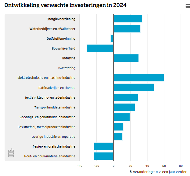 Bedrijven in de energievoorziening zijn het positiefst gestemd en verwachten ruim een derde meer te investeren in 2024. Het gaat om bedrijven die handelen in elektriciteit, aardgas, stoom en gekoelde lucht, of die betrokken zijn bij de productie of distributie daarvan. Ook bedrijven die zich bezighouden met water en afvalbeheer verwachten een dergelijke investeringsgroei. Van de ondervraagde bedrijfstakken is de bouwnijverheid het somberst; bouwbedrijven voorzien een investeringskrimp van een derde ten opzichte van 2023.