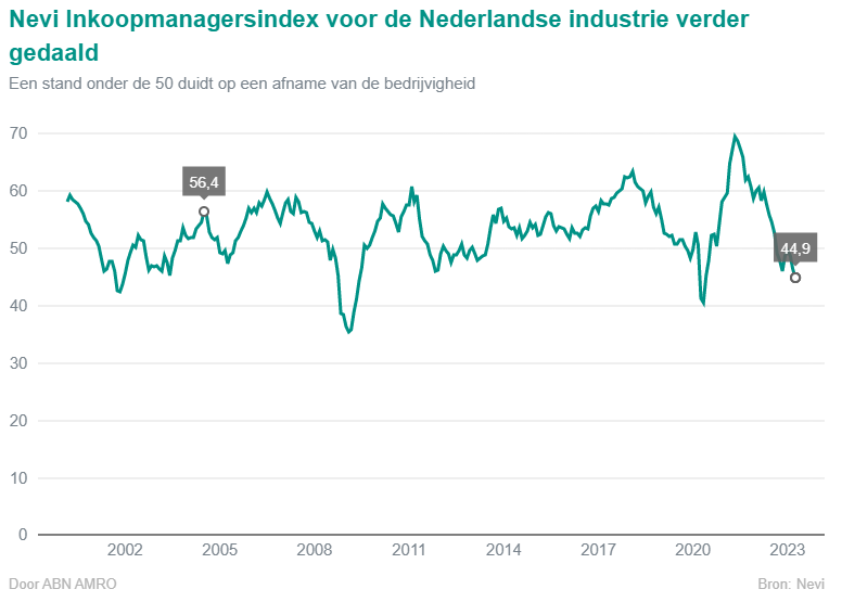 De Nevi Inkoopmanagersindex voor de Nederlandse industrie is in april verder gedaald, van 46,4 in maart naar 44,9 in april, wat duidt op een verdere afname van de bedrijvigheid.