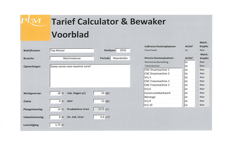 De TCB is speciaal ontwikkeld voor maakbedrijven met maximaal 15 werknemers en 10 kostenplaatsen (tarieven). Of u nu werkt met gecombineerde man-machinetarieven of (deels) met aparte tarieven voor mensen en machines, met de TCB-tool is dit allemaal mogelijk.