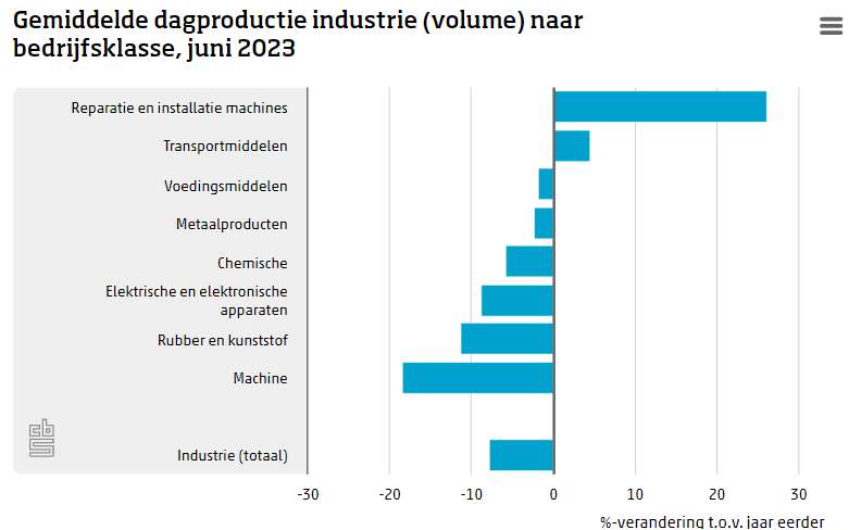 De gemiddelde dagproductie van de Nederlandse industrie was in juni 7,7 procent lager dan in juni 2022, maakt het CBS bekend. Ook in de voorgaande maanden van 2023 kromp de productie op jaarbasis. De meeste bedrijfsklassen van de industrie produceerden minder dan in dezelfde maand een jaar eerder. Van de grote branches noteerde de machine-industrie de grootste productiedaling. De reparatie en installatie van machines had de grootste toename van de productie.