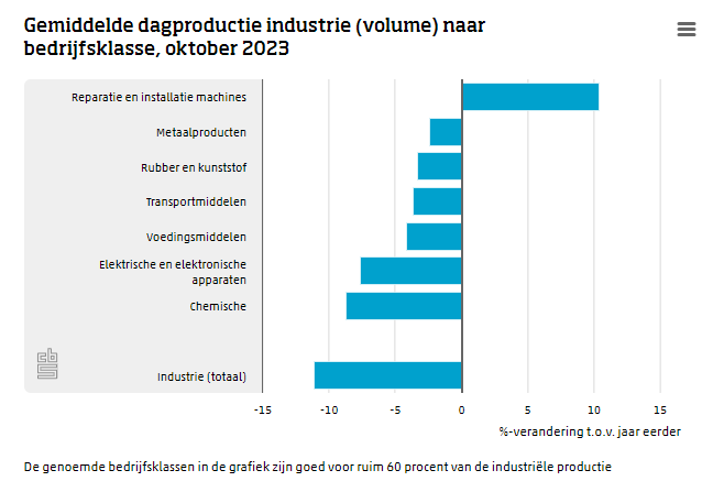 De gemiddelde dagproductie van de Nederlandse industrie was in oktober 11,1 procent lager dan in oktober 2022, maakt het CBS bekend. Ook in de voorgaande maanden van 2023 kromp de productie op jaarbasis.