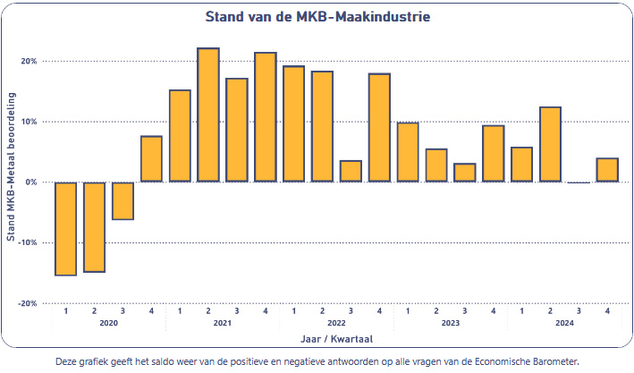 Na een teleurstellend derde kwartaal, is er in het vierde kwartaal van 2024 voor de MKB-maakindustrie sprake van slechts een karig herstel. Uit cijfers van de Koninklijke Metaalunie Economische Barometer blijkt dat de waardering van de huidige orderpositie positiever is dan een kwartaal eerder, net als het bedrijfsresultaat. Maar daar staat tegenover dat de orderpositie voor zowel het binnen- als buitenland in het vierde kwartaal per saldo verder is afgenomen.