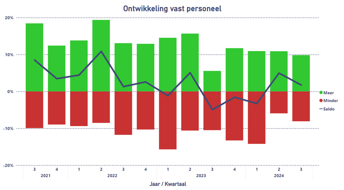 Bij de bedrijven die aan de Economische Barometer hebben deelgenomen, werken gemiddeld 18,6 medewerkers. Hiervan is 16 fte vast in dienst en gemiddeld 2,6 fte wordt ingeleend. Het aandeel bedrijven dat meer vast personeel in dienst heeft, is in het derde kwartaal van 2024 weer iets toegenomen. Bij 8% van de respondenten is het aantal vaste krachten afgenomen, terwijl dit bij 10% is toegenomen. Voor het flexibele personeel geldt het omgekeerde: net iets meer bedrijven melden een afname dan een toename van dit aandeel.