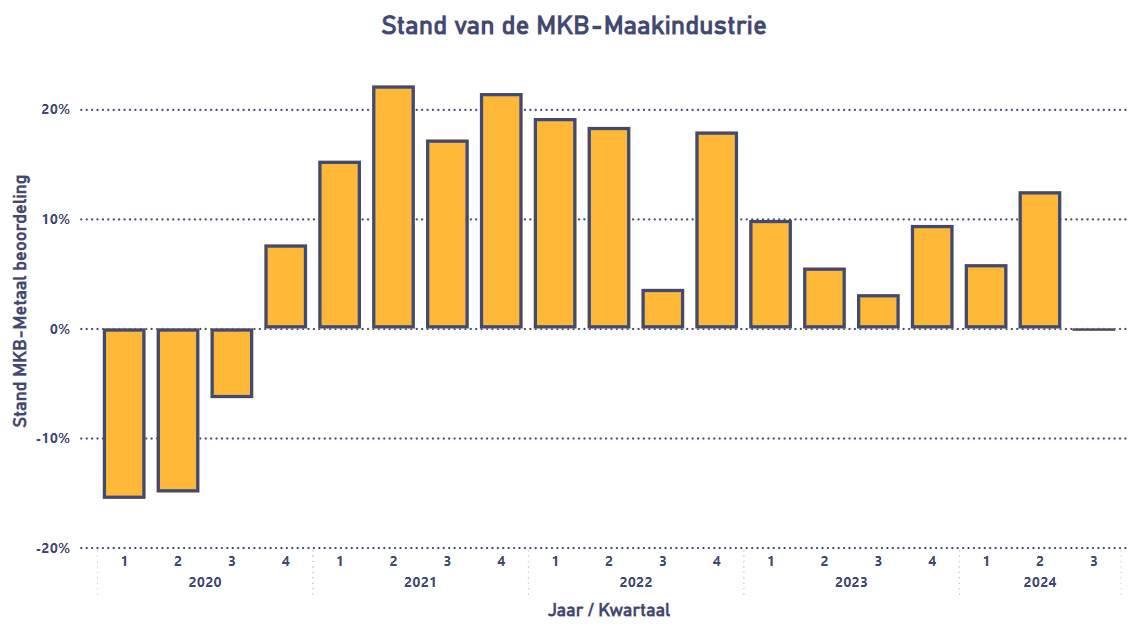 Ieder kwartaal doet Koninklijke Metaalunie onderzoek onder haar leden naar de stand van de MKB-maakindustrie. Het onderzoek bestaat uit diverse vragen over onder andere de orderpositie, export en personeel. Het derde kwartaal van de Economische Barometer is traditioneel hét kwartaal waarin de bedrijvigheid door de zomervakantie op een lager pitje staat. Dit geldt zeker voor de uitkomsten van de Economische Barometer Q3 2024. Daar komt nu nog bij dat de verwachtingen voor het vierde kwartaal in twee jaar niet zo somber geweest zijn.